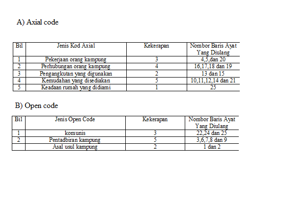 Berdasarkan analisis kualitatif yang dijalankan responden lebih banyak bercerita mengenai axial code berbanding open code. terdapat 5 jenis axial code yang berbanding open code yang hanya mempunyai 3 jenis. Antara jenis axial code yang diceritakan ialah pekerjaan orang kampung, perhubungan orang kampung, pengangkutan dan kemudahan orang kampung. Manakala bagi axial code pula ialah komunis, pentadbiran kampung dan asal-usul kampung.